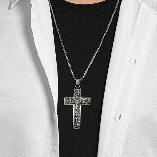 Kemstone Vintage Floral Engraved Cross Stainless Steel Pendant Necklace for Men K-PT703