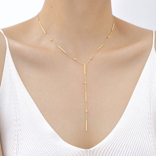 Collar minimalista Kemstone de acero inoxidable con borlas en forma de Y y cuentas espaciadoras cuadradas: detalles dorados atemporales para una elegancia cotidiana NC-2049