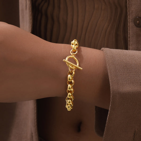 Elegante pulsera ajustable de acero inoxidable dorado con cadena de perlas redondas y cierre de seguridad OT: joyería minimalista para mujer con glamour diario BR2105