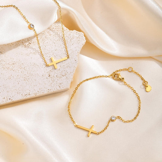 Collar con colgante de cruz de resplandor eterno - Joyería de acero inoxidable con circonitas blancas en tono dorado para mujer, hipoalergénico, elegante y cotidiano NC-782