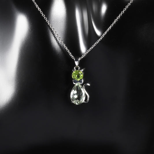 Collar con colgante de gato de piedra preciosa natural, diseño original artesanal de Kemstone, con detalles de amatista verde y peridoto, 45,7 cm, K23515N