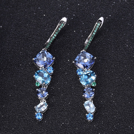 Pendientes colgantes de zafiro y topacio de diseño original hechos a mano por Kemstone en plata de ley 925. Pendientes de piedras preciosas para mujer.