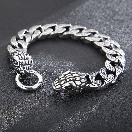 Pulsera Kemstone estilo punk con doble cabeza de serpiente, cadena cubana de acero y titanio, con acabado mate vintage y patrones grabados para hombre KB161368-KJX