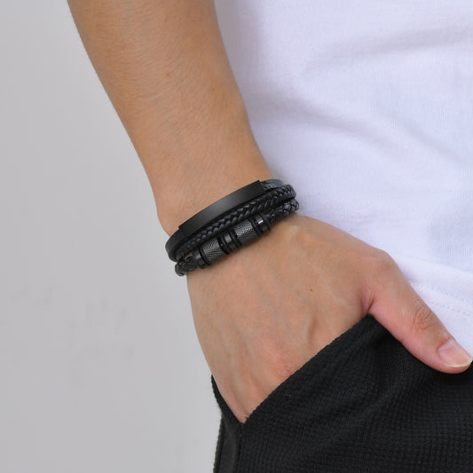 Kemstone Men’s Black Leather Bracelet – Braided Band with Titanium Steel Detail BL-703