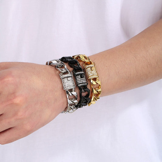 Kemstone Iced Out Cuban Link Bracelet for Men – Stainless Steel Dragon Buckle Hip Hop Punk KB186442-Z