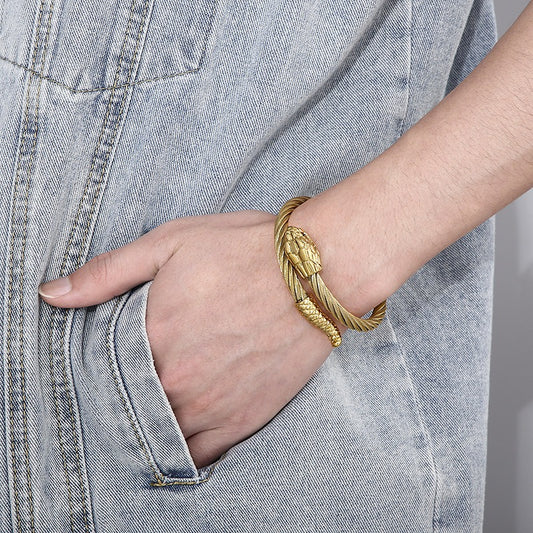 Kemstone Snake Head Stainless Steel Bracelet – Gothic Punk Open Cuff for Men, Dual or Single Layer, Retro Viking Style KB156931