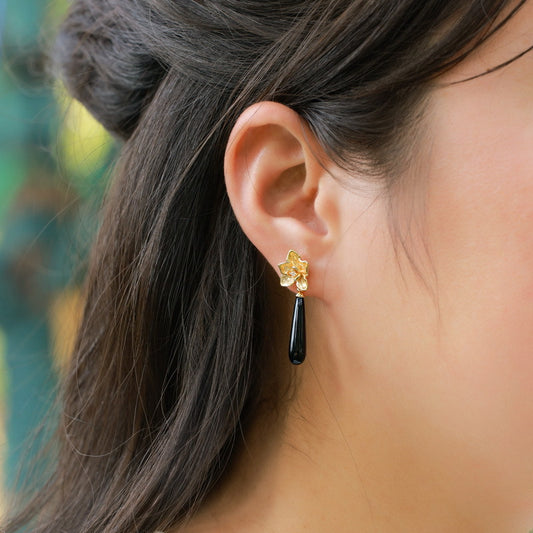 Kemstone 925 Sterling Silver Gold-Plated Black Onyx Flower Drop Earrings – Elegant Teardrop Dangle Jewelry for Women