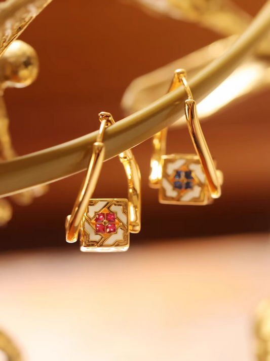 Pendientes de esmalte asimétrico "Culaccino" de diseño original artesanal de Kemstone: plata de ley 925 con circonitas cúbicas y tachuelas geométricas de inspiración vintage.
