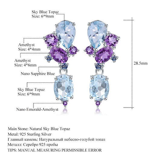 Pendientes colgantes de plata de ley S925 con amatista natural (2,60 ct), topacio azul cielo (3,47 ct) y citrino (2,60 ct) de diseño original, hechos a mano por Kemstone.