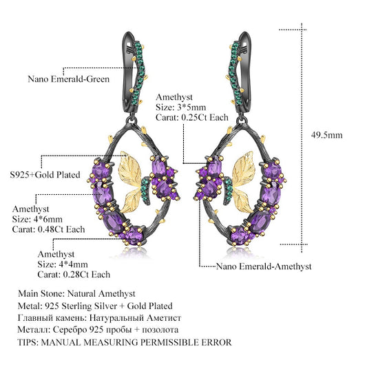 Pendientes colgantes de amatista natural de 0,48 ct con diseño original de Kemstone, hechos a mano, con diseño de mariposa, en plata de ley S925, 5 cm