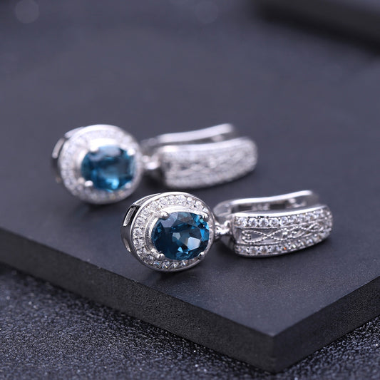 Pendientes colgantes elegantes de topacio azul Londres natural, diseño original, hechos a mano por Kemstone | Plata de ley 925, K23614E