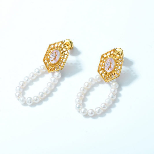 Pendientes de perlas de agua dulce grandes, hechos a mano, de estilo vintage, con diseño original de Kemstone - Plata S925 con baño de oro de 10 quilates