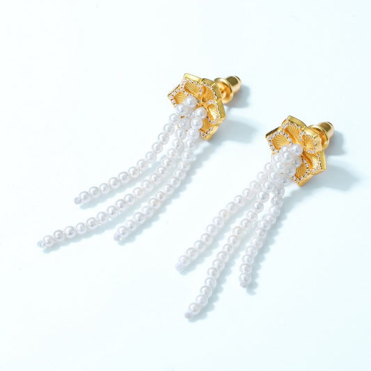 Pendientes largos con borlas de perlas, diseño original y moderno, hechos a mano por Kemstone - Plata S925 con baño de oro de 10 quilates.