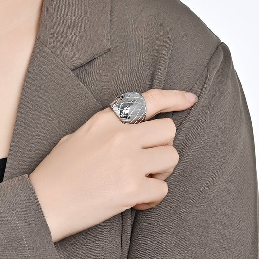 Anillo de acero inoxidable con malla geométrica: joyería artesanal moderna para mujer, un regalo de lujo para el día a día y un toque atemporal. K-R973