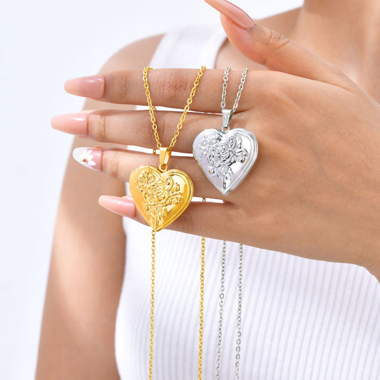 Collar con colgante de foto de corazón de rosa de acero inoxidable para mujer - Regalo de joyería grabado personalizado, elegante recuerdo para sus seres queridos PN-2093