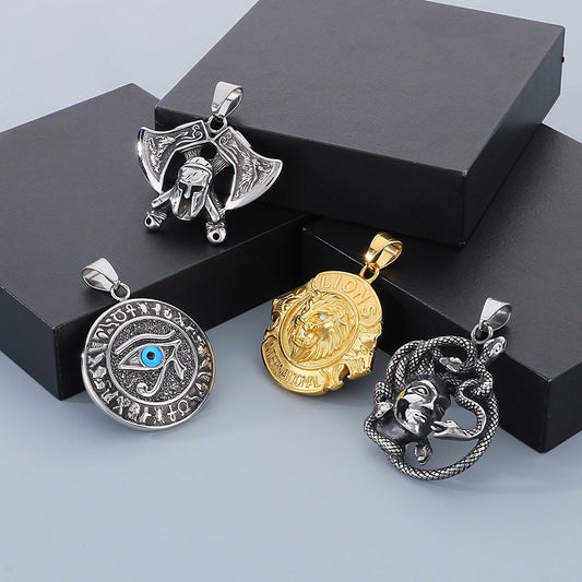 Colgante Kemstone Hiphop Mythology Series - Collar de acero y titanio con máscara de hacha de doble cara y diosa serpiente del mal de ojo para hombre KP130917-MZOZ