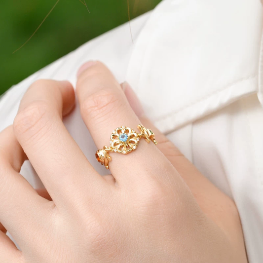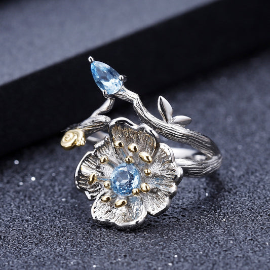 Anillo de flor de citrino natural, diseño original, hecho a mano por Kemstone, plata de ley 925. Anillo abierto de diseñador con diseño floral de topacio azul suizo.