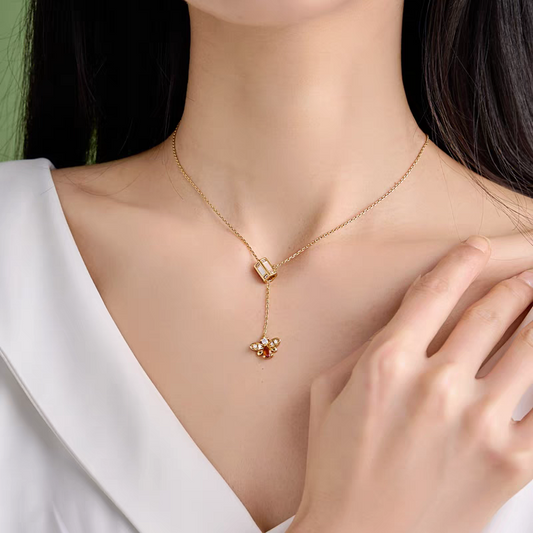 Collar de abeja "Buscador de Miel" de diseño original artesanal de Kemstone. Plata de ley 925, granate espesartita, concha blanca, circonita cúbica y cadena ajustable. Un regalo único de inspiración vintage.