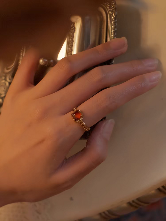 Anillo de granate espesartita con diseño original de flor de corazón, hecho a mano por Kemstone. Cadena vintage ajustable bañada en oro y plata. Anillo moderno de banda abierta para uso diario.