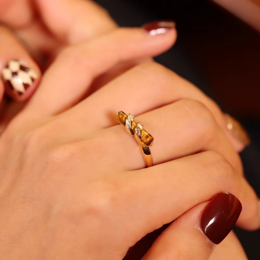 Anillo de ojo de tigre de plata de ley 925 bañado en oro con circonita cúbica, diseño original "Anillos Luminosos", hecho a mano, estilo vintage, hecho a mano, con diseño minimalista francés para mujer.