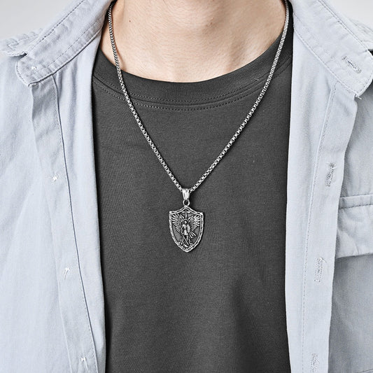 Kemstone Winged Shield Stainless Steel Pendant Necklace for Men – Vintage Relief Cross-Form Design K-PT515