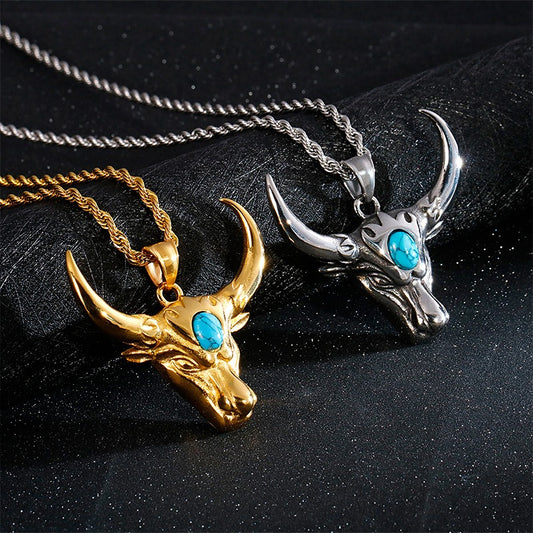 Collar punk de titanio turquesa con diseño de cuerno de toro Kemstone - Accesorios de acero inoxidable para hombre KP81530-K