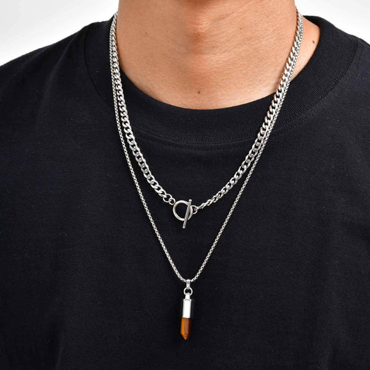 Kemstone Men’s Stainless Steel Bullet Pendant Necklace – Tiger Eye & Black Agate Minimalist Jewelry PN-2227