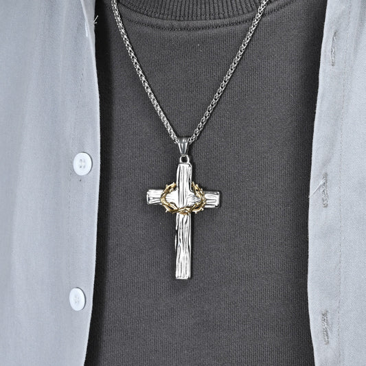 Kemstone Men’s Titanium Steel Cross Necklace – Vintage Wreath Pendant K-PT530