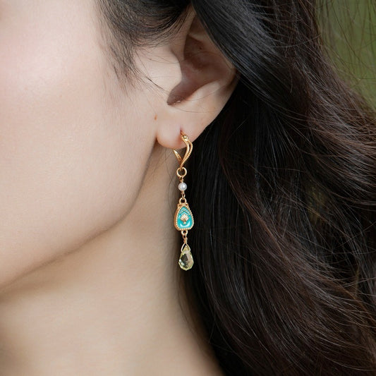 Pendientes colgantes de peridoto esmaltado, diseño original, hechos a mano por Kemstone para mujer - Plata S925 con baño de oro de 10 quilates