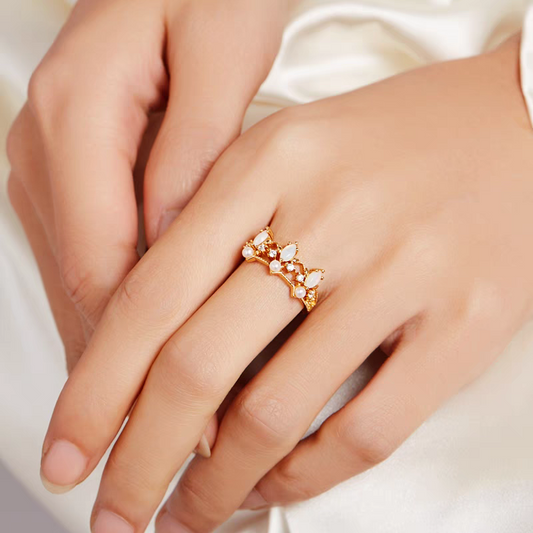 Anillo de corona de ópalo vintage "Princesa y Caballero", diseño original artesanal de Kemstone. Plata de ley 925 con baño de oro. Anillo ajustable de doble capa con banda abierta. Un regalo único para mujer.