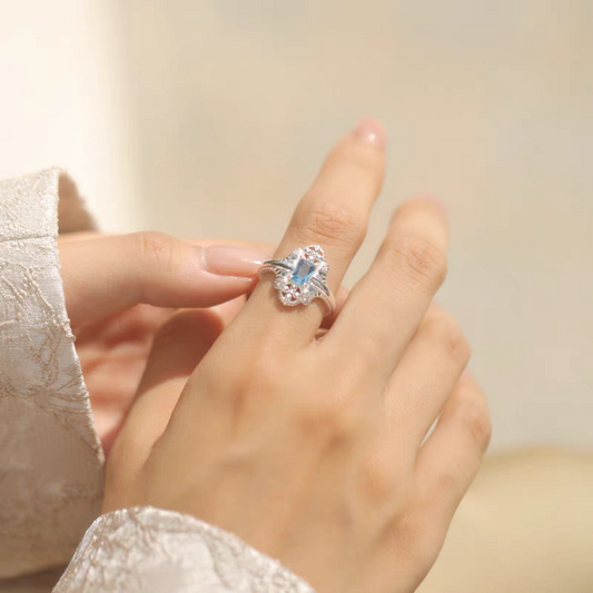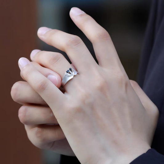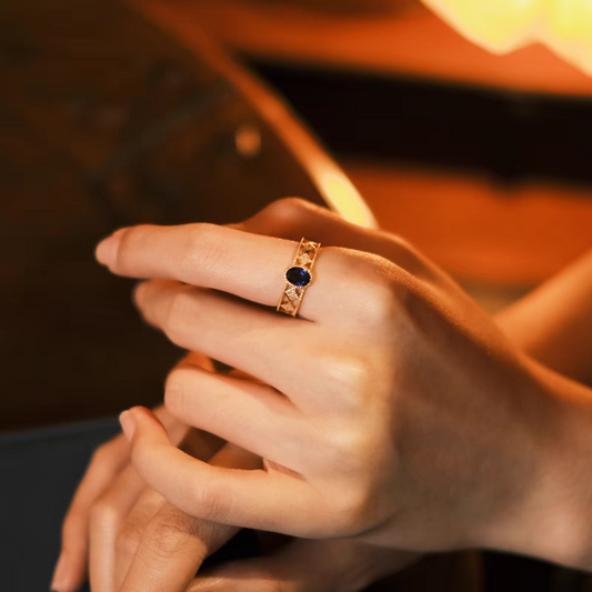 Anillo Viaje Celestial de diseño original artesanal de Kemstone: anillo de zafiro en plata de ley bañada en oro con detalles de circonitas cúbicas.