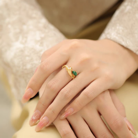 Anillo de esmeralda de diseño original artesanal de Kemstone: Libertad y Renovación en plata bañada en oro con malaquita.