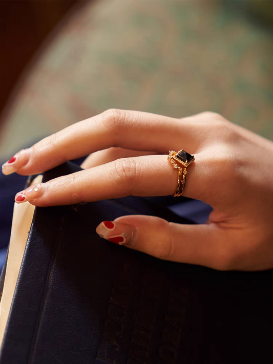 Anillo ajustable de ópalo negro y citrino, diseño original artesanal de Kemstone, "Atardecer al Atardecer", en plata de ley con baño de oro vermeil. Anillo abierto vintage de lujo.