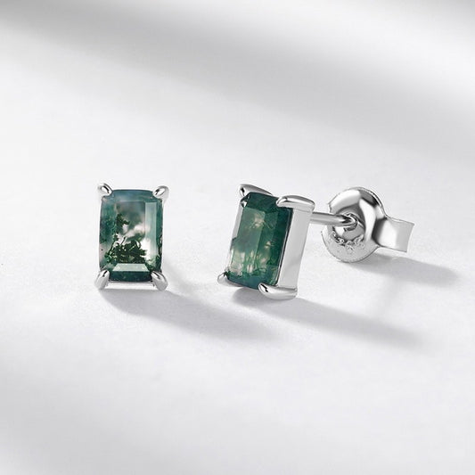 Pendientes de ágata musgosa de diseño original hechos a mano por Kemstone - Diseño geométrico, pendientes de botón de plata de ley S925 para mujer