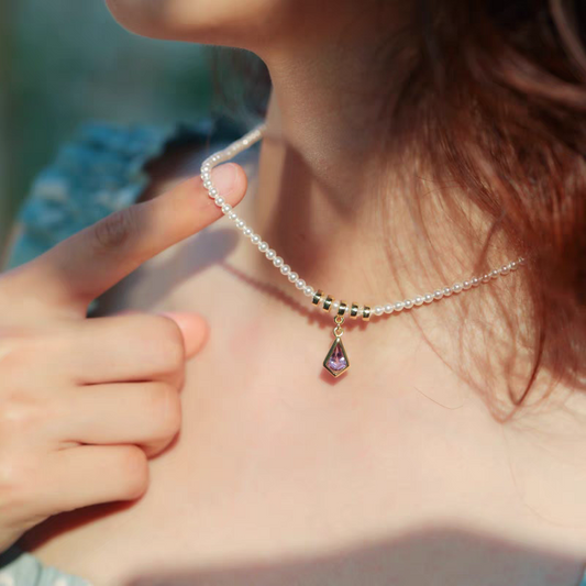 Elegante collar de cometa morada, diseño original y artesanal de Kemstone. Colgante de amatista y perla en plata de ley 925. Gargantilla francesa corta de lujo para mujer.