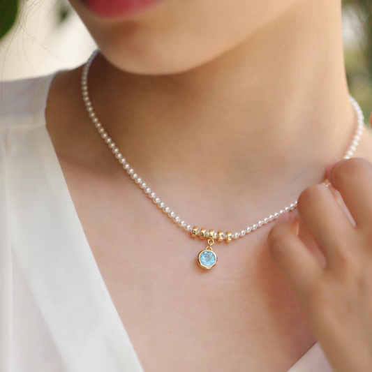 Collar JCE Blue Fireworks, diseño original artesanal de Kemstone: topacio azul suizo, cuentas de cristal y gargantilla ajustable de perla, diseño de lujo en plata 925.