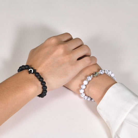 Kemstone Adjustable Half Heart Puzzle Beaded Bracelet Set for Men & Women – Black Onyx & White Howlite CB-175