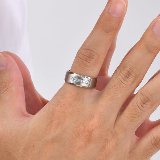 Kemstone Brushed Stainless Steel Ring with Channel Set Cubic Zirconia – 8mm Band for Men R-695