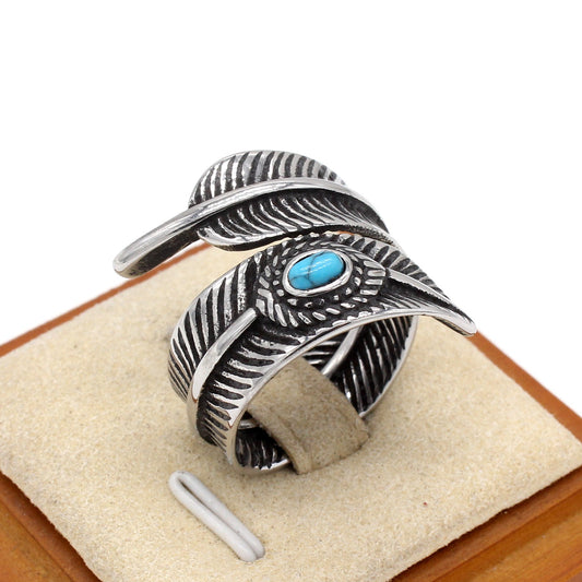 Kemstone Titanium Steel Feather Turquoise Ring – Vintage Tribal Style for Men R1922