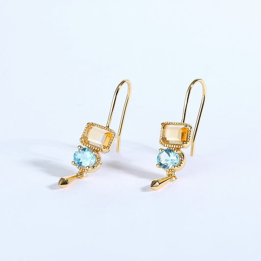Pendientes geométricos de lujo de Kemstone, hechos a mano, con citrino natural y topacio azul suizo, diseño original - Plata de ley S925 bañada en oro