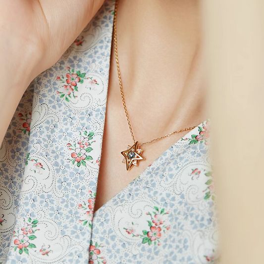 Collar vintage de topacio azul "Estrella en el Mar de la Gente", diseño original artesanal de Kemstone. Plata de ley bañada en oro. Colgante de estrella con detalles de circonitas, 45,7 cm.