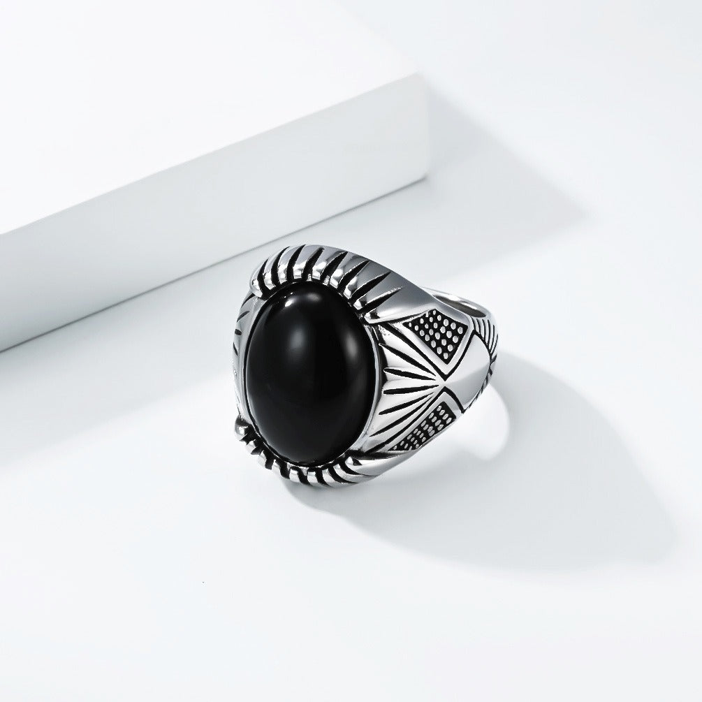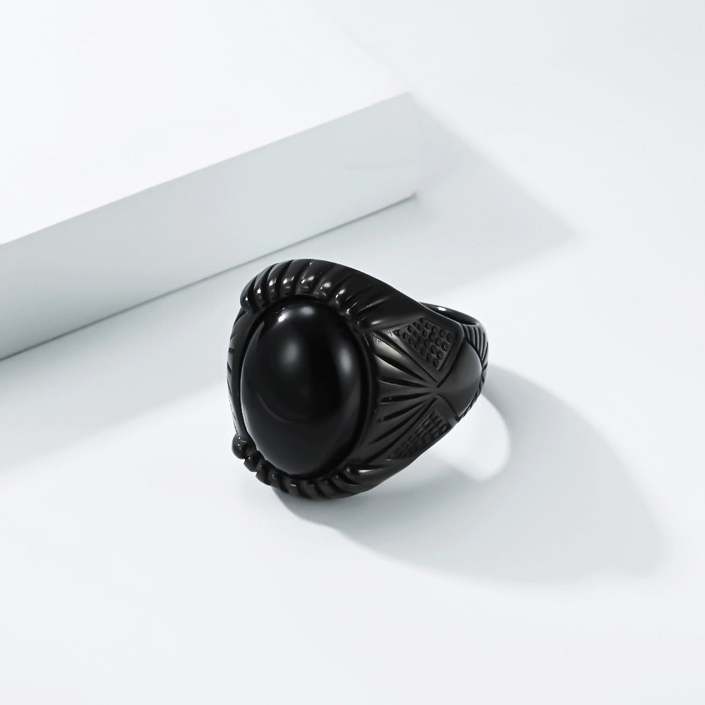 Wear this black inlay stainless steel signet ring for men; the smooth domed surface sits centered on the finger, delivering balanced weight and a steady, controlled presence.