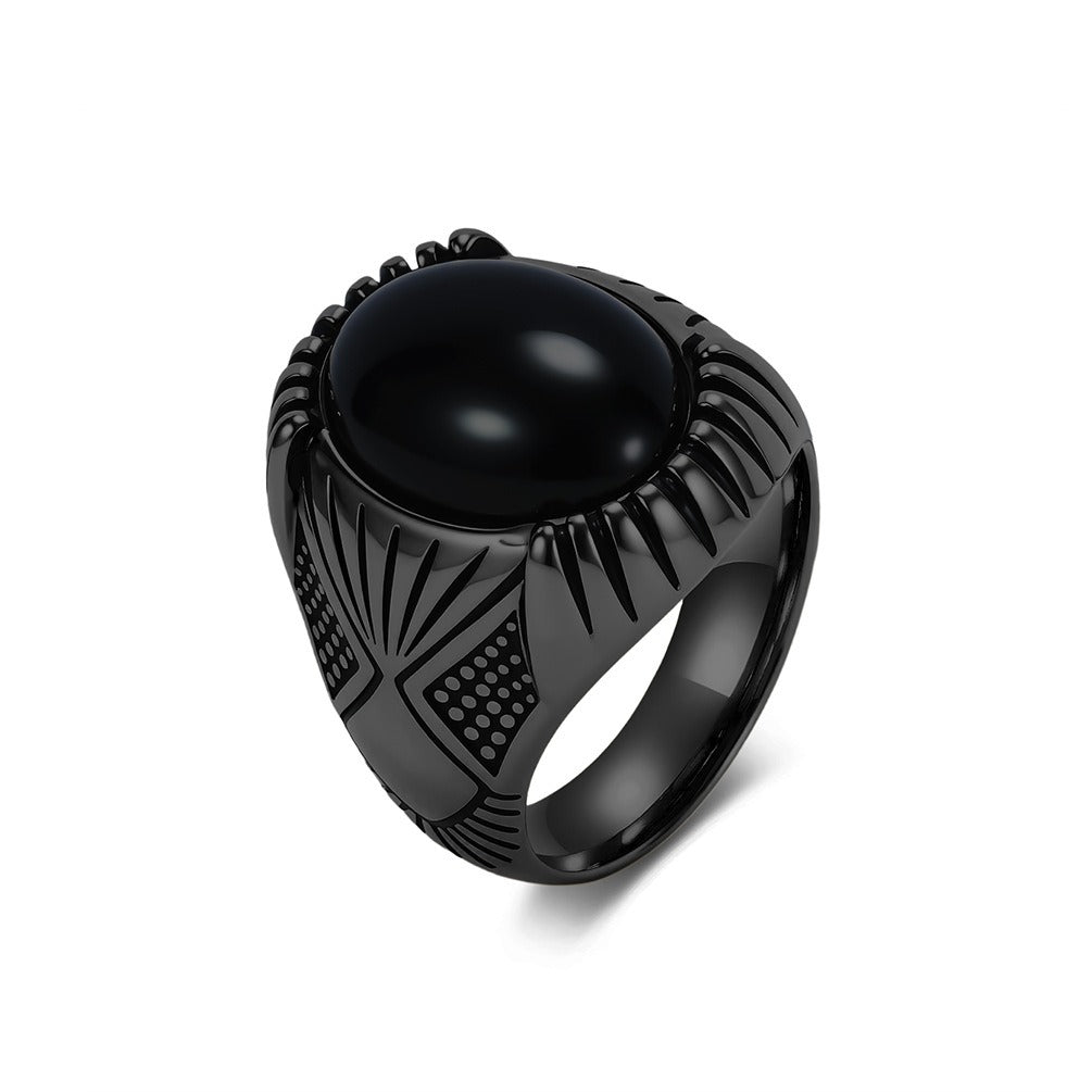 Smooth domed black inlay creates deep visual focus without any gemstone claim.