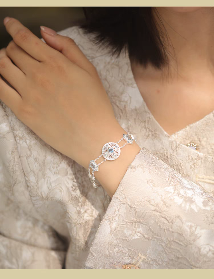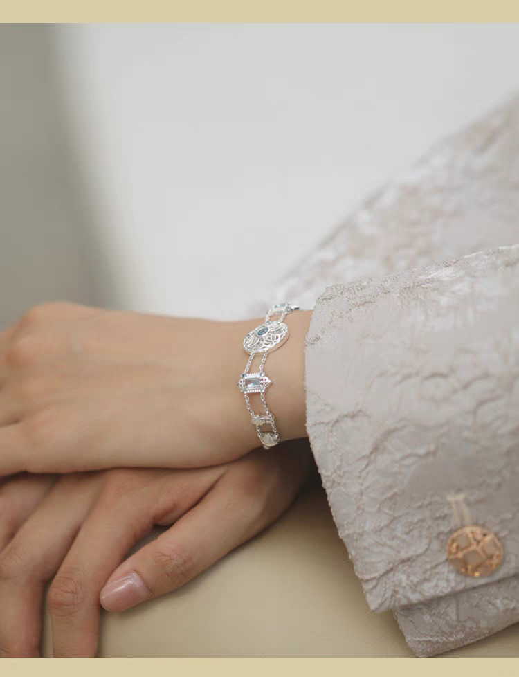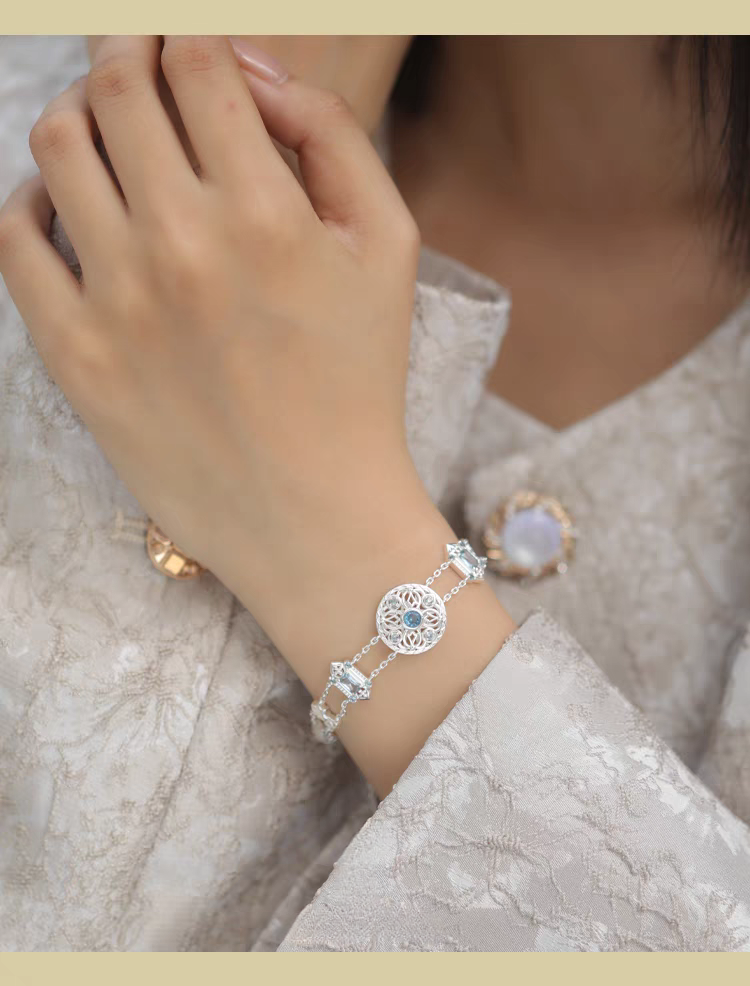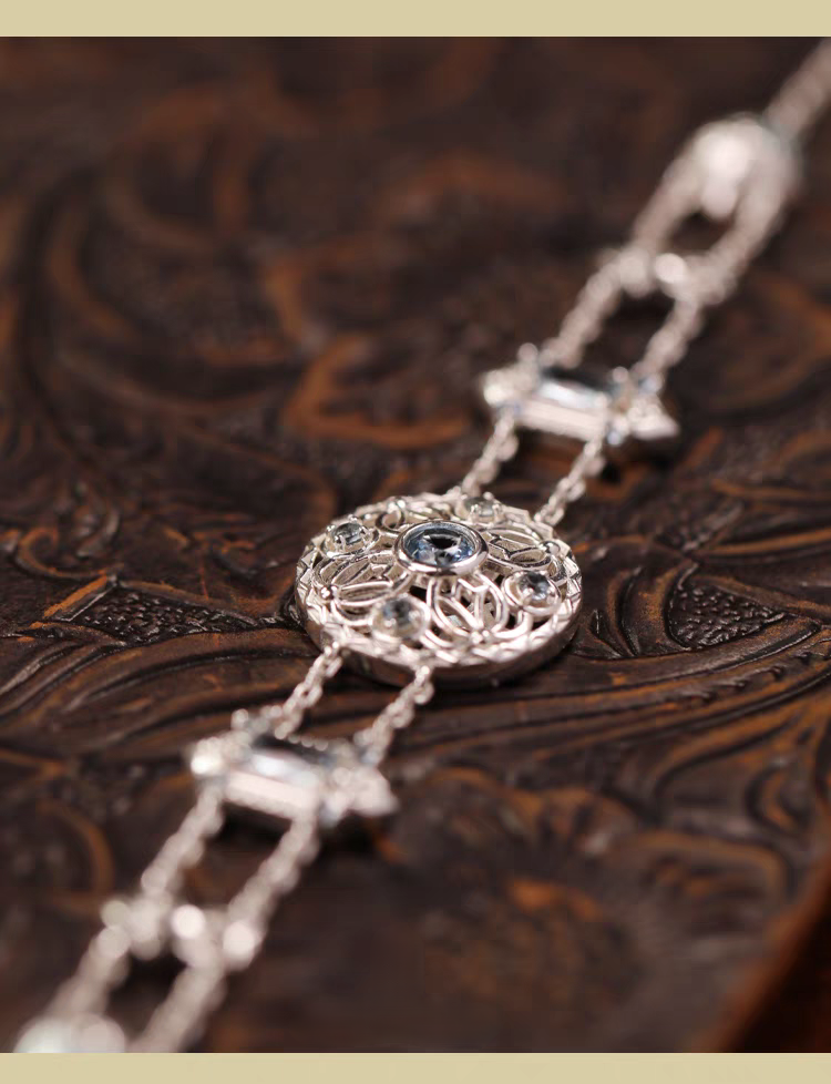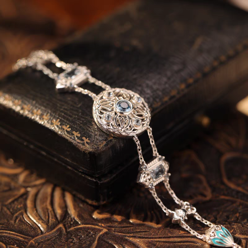 Esta pulsera de plata de ley inspirada en el Taj Mahal encarna la elegancia atemporal y la sofisticación romántica. Su pieza central presenta un colgante redondo calado con motivos florales que evocan las intrincadas tallas en piedra del monumento. La pieza central de espinela azul intenso simboliza las tranquilas piscinas que rodean el Taj Mahal, flanqueada por detalles de espinela azul claro que le dan un toque radiante. Elaborada íntegramente en plata de ley 925, la pulsera combina durabilidad con una sensación de lujo. Su longitud ajustable garantiza un ajuste cómodo, lo que la convierte en un regalo ideal o un accesorio para el día a día. Celebra el amor eterno y la pureza con este exquisito diseño hecho a mano, perfecto para cualquier ocasión.