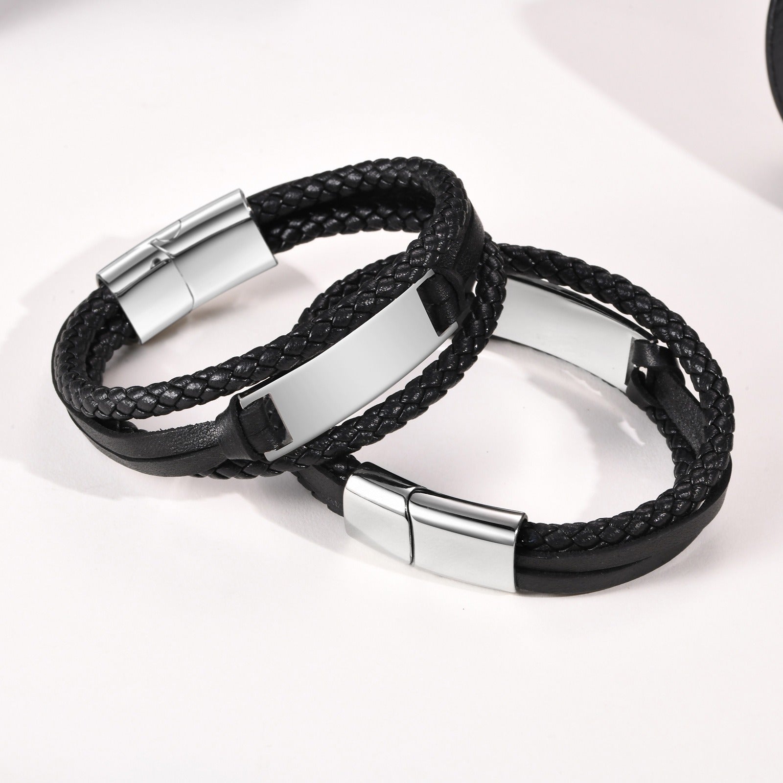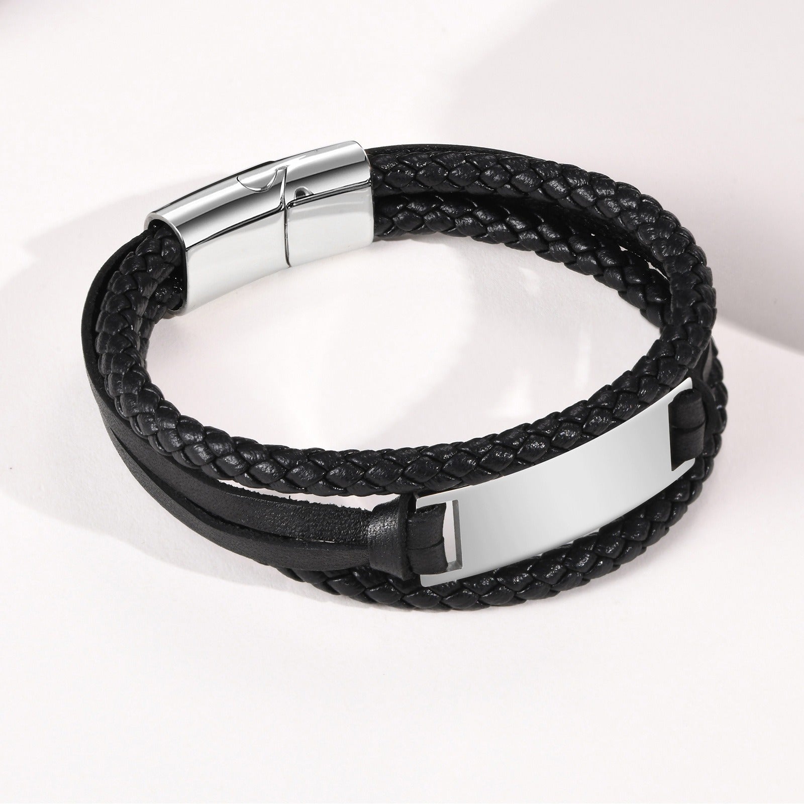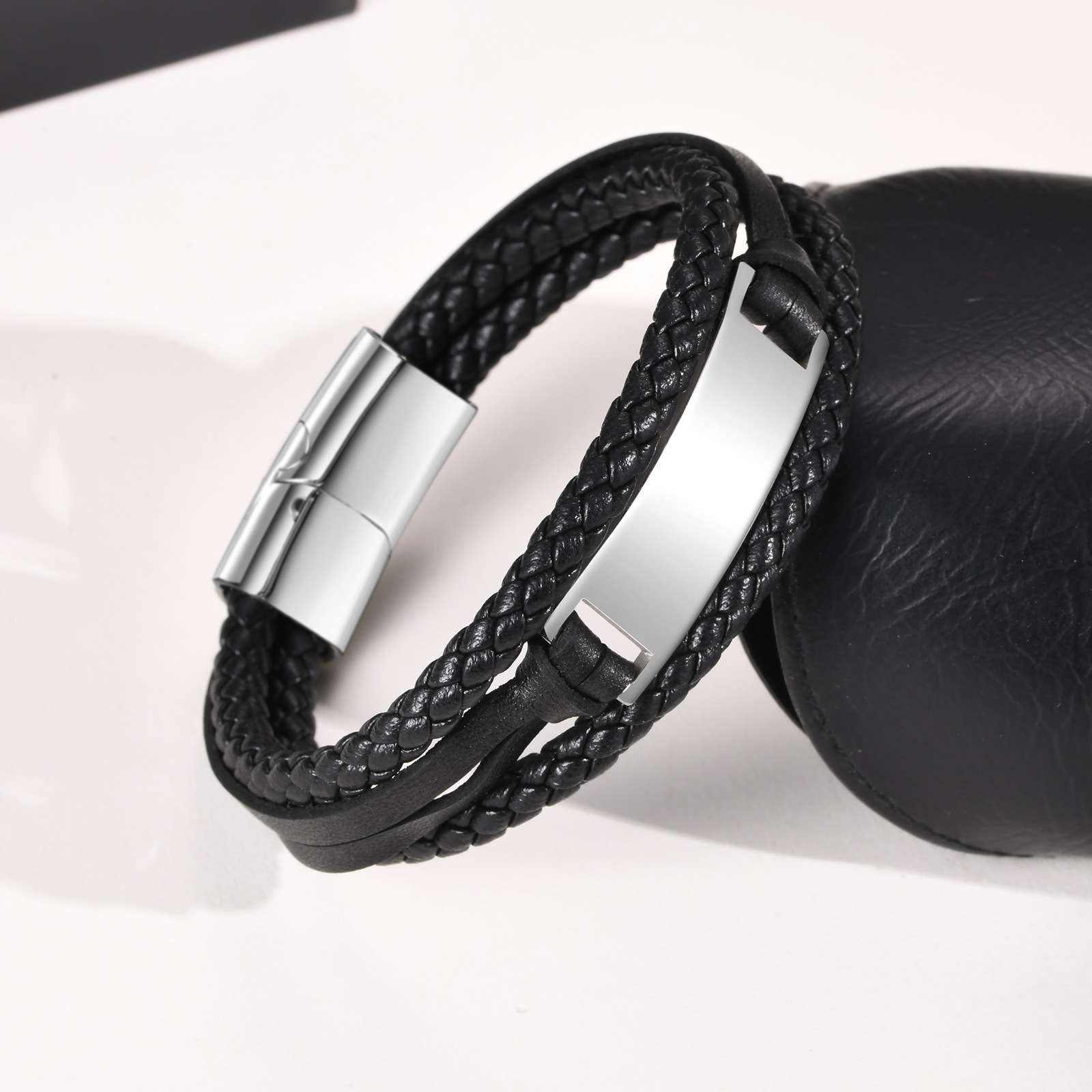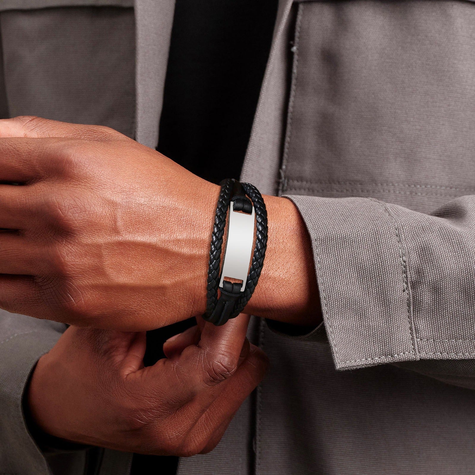 Wear this men’s braided leather bracelet to keep your style clean and grounded. A stainless steel ID bar and magnetic clasp offer balance, ease, and everyday confidence.