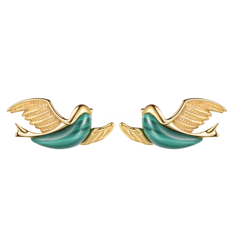 Pendientes de pájaro esmeralda de malaquita y plata de ley, hechos a mano por Kemstone, con diseño original: un regalo elegante y de lujo de estilo retro.
