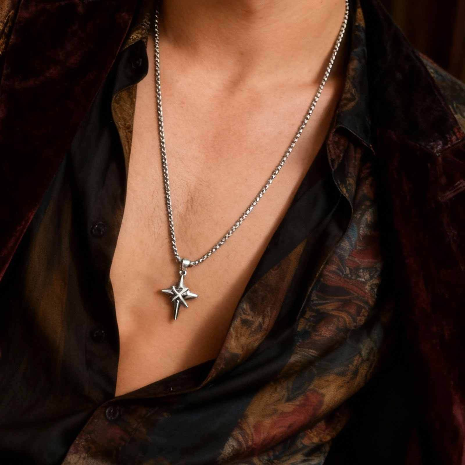 Wear focused energy into your style with this stainless steel four-point star pendant necklace for men. Black Cubic Zirconia detail adds contrast and modern edge.