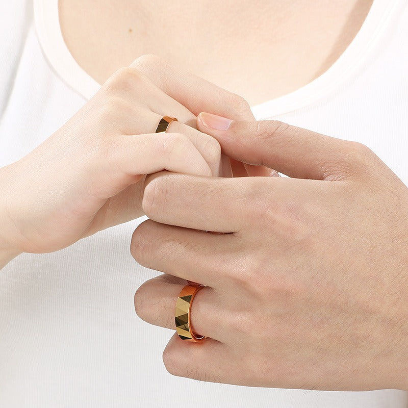 Celebrate unity and strength with Kemstone’s gold plated tungsten couple rings — faceted V-cut design reflecting two souls shining as one.