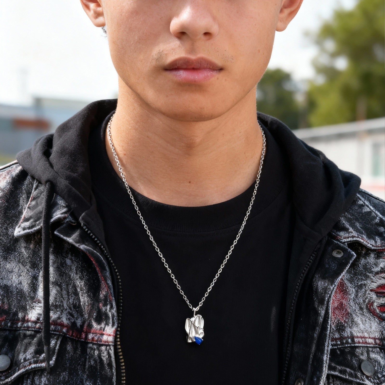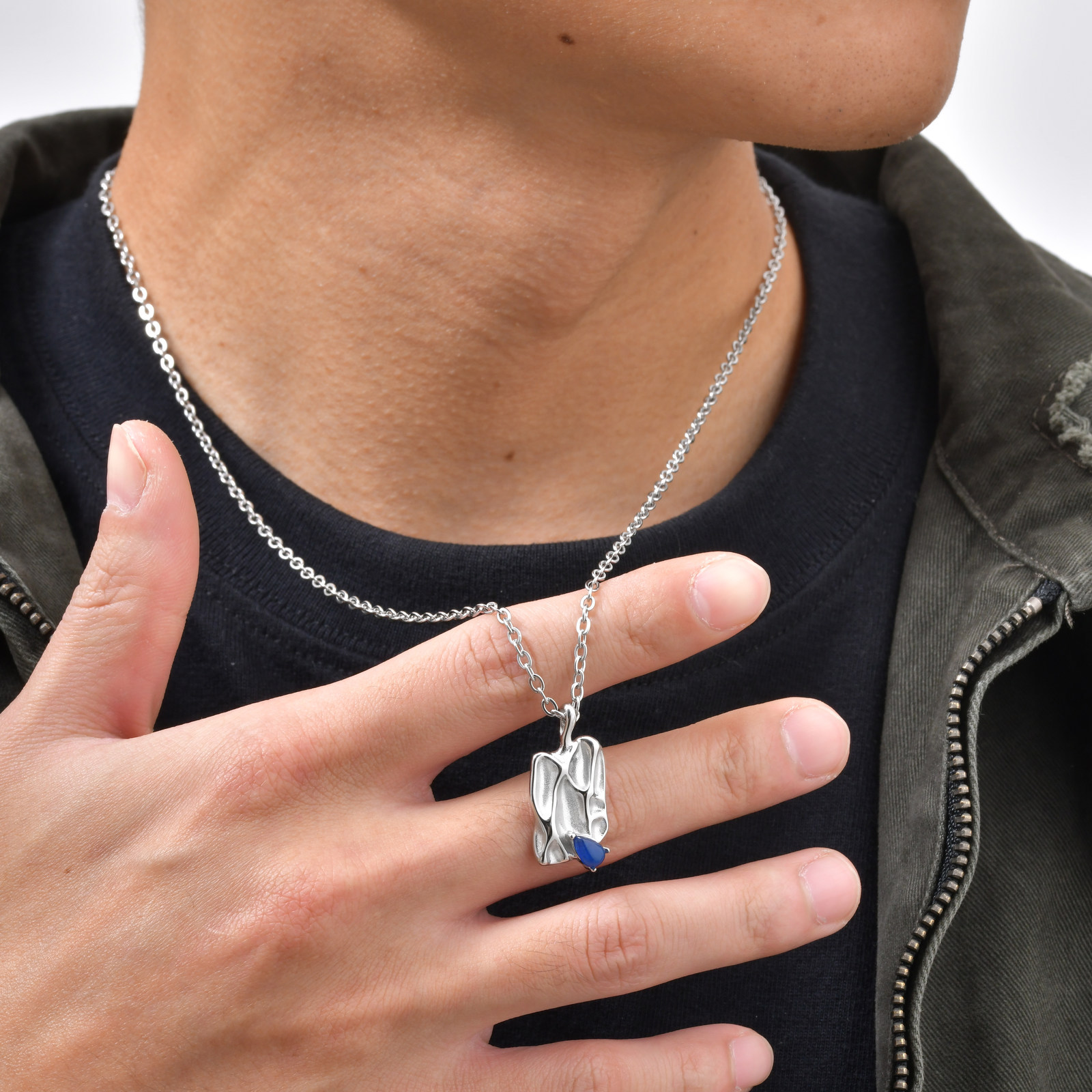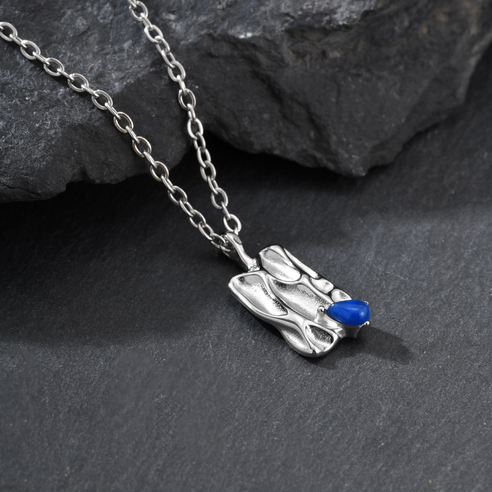 Wear this stainless steel pendant with sculpted texture and blue inlay stone, resting balanced on the chest to deliver calm structure and a steady, controlled presence for daily men’s wear.