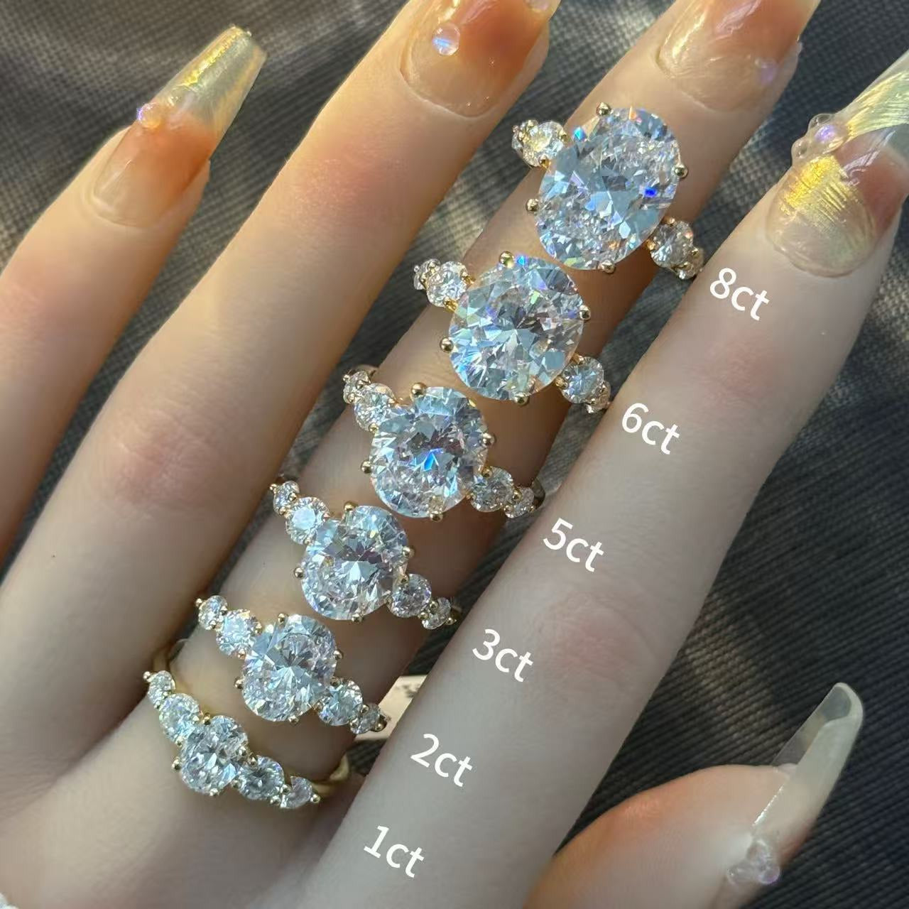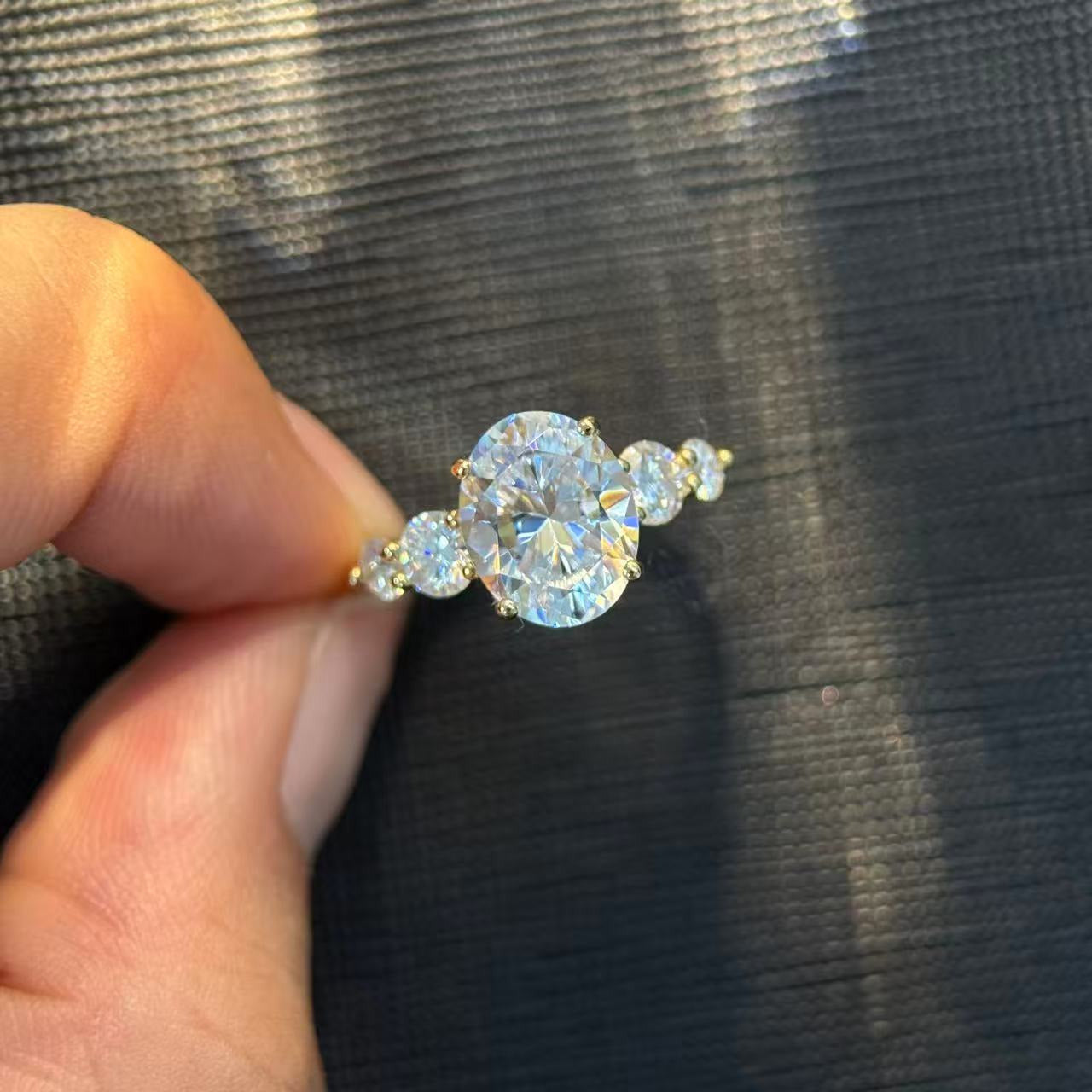 Designed with a brilliant oval-cut moissanite as the centerpiece, supported by two stones on each side. This five-stone layout symbolizes milestones, growth, and enduring love — ideal for brides, anniversaries, or luxury fashion styling.